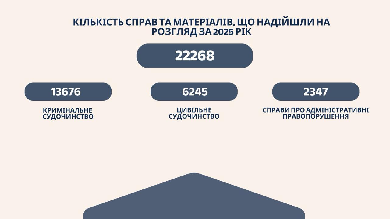 За звітний період до суду надійшло 22 268 справ і матеріалів, з яких 21 124 було розглянуто.