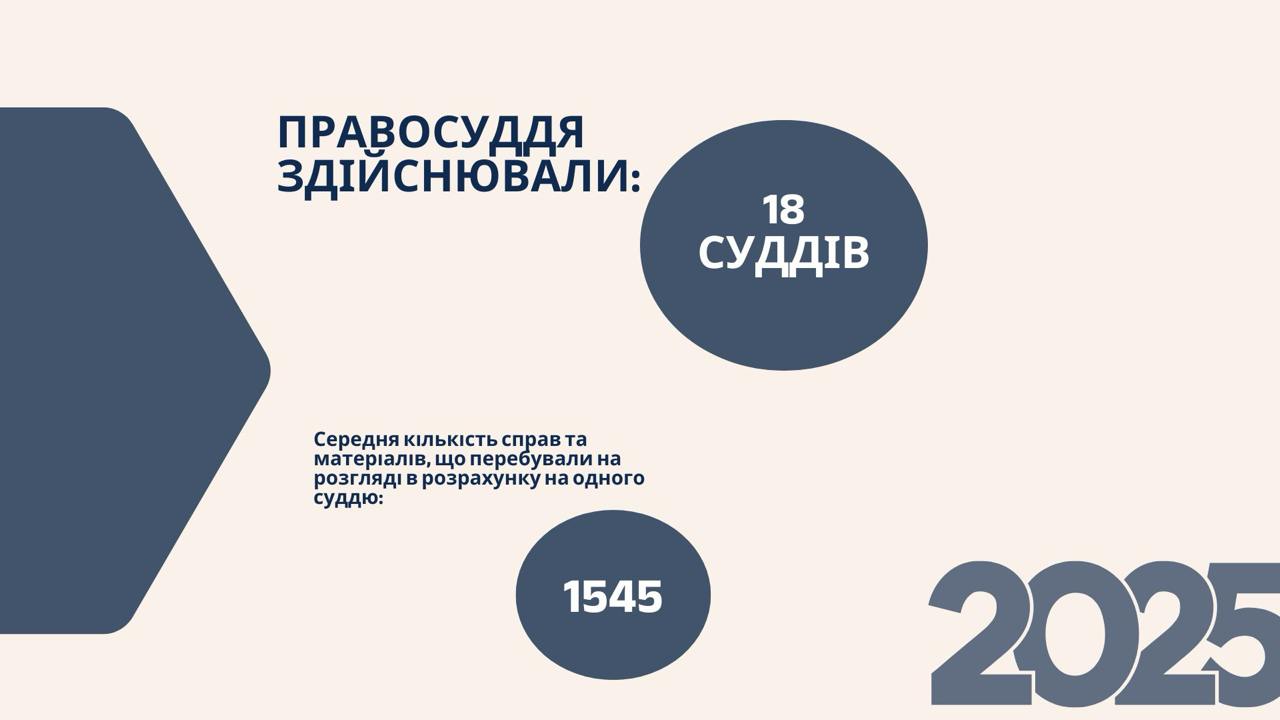 Правосуддя у 2025 році здійснювали 18 суддів. Середня кількість справ та матеріалів, що перебували на розгляді в розрахунку на одного суддю, склала 1 545.