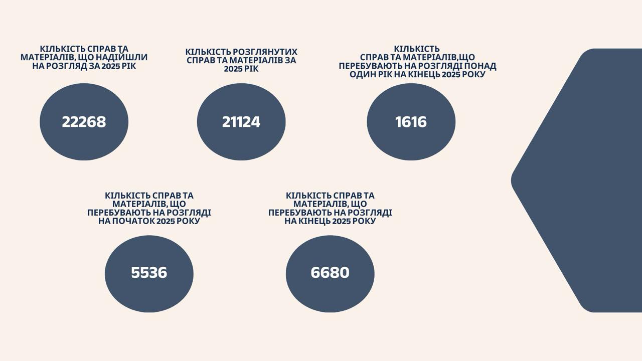 Станом на початок 2025 року на розгляді перебувало 5 536 справ та матеріалів, а на кінець року — 6 680. Водночас кількість справ і матеріалів, що перебували на розгляді понад один рік станом на кінець 2025 року, становить 1 616.