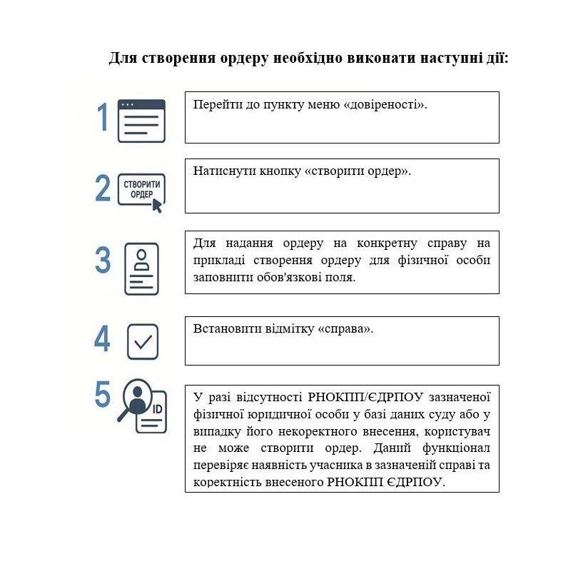 Відповідно до пункту 30 Положення про ЄСІТС та пункті 11.5 Інструкції з використання підсистеми «Електронний кабінет» ЄСІТС користувачі, які підтвердили свої повноваження адвоката мають можливість видати ордер на конкретну справу для отримання доступу до документів по справі та загальний ордер (без вказання номера справи), який спрощує та прискорює процес подачі заяв до суду.