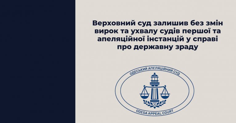 • Вирок суду першої інстанції та ухвалу апеляційного суду, якими колишнього керівника однієї з окружних прокуратур Миколаївської області визнано винним у вчиненні державної зради (ч. 2 ст. 111 Кримінального кодексу України) і призначено покарання у вигляді довічного позбавлення волі з конфіскацією всього майна, яке належить йому на праві власності — залишити без змін.