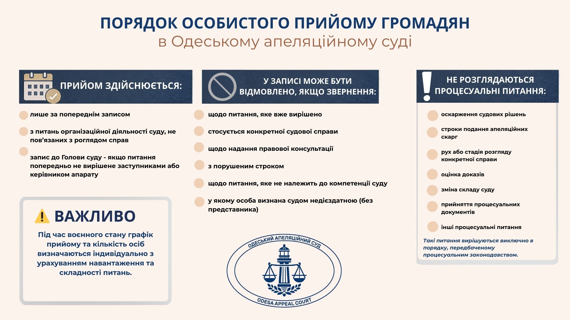 З метою забезпечення прозорості та належної організації роботи повідомляємо про порядок здійснення особистого прийому громадян керівництвом суду.